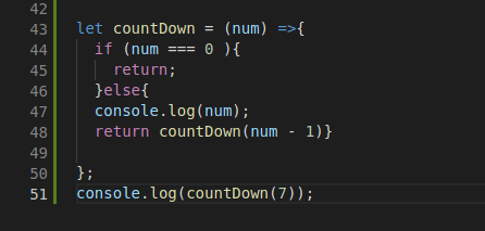 When we first call the function on line 51, we call 7 as an argument. Within the function, we provide an If Statement, that says if the number passed as an argument strictly equals the value of 0, return or break the function. Otherwise, we then console.log() the number so we can track the function, then callback the function countDown() within itself, with the value of the argument minus 1, effectively telling it to repeat but with a smaller number. Once the argument or “num” equals 0, the function stops. Within the console we see the following: